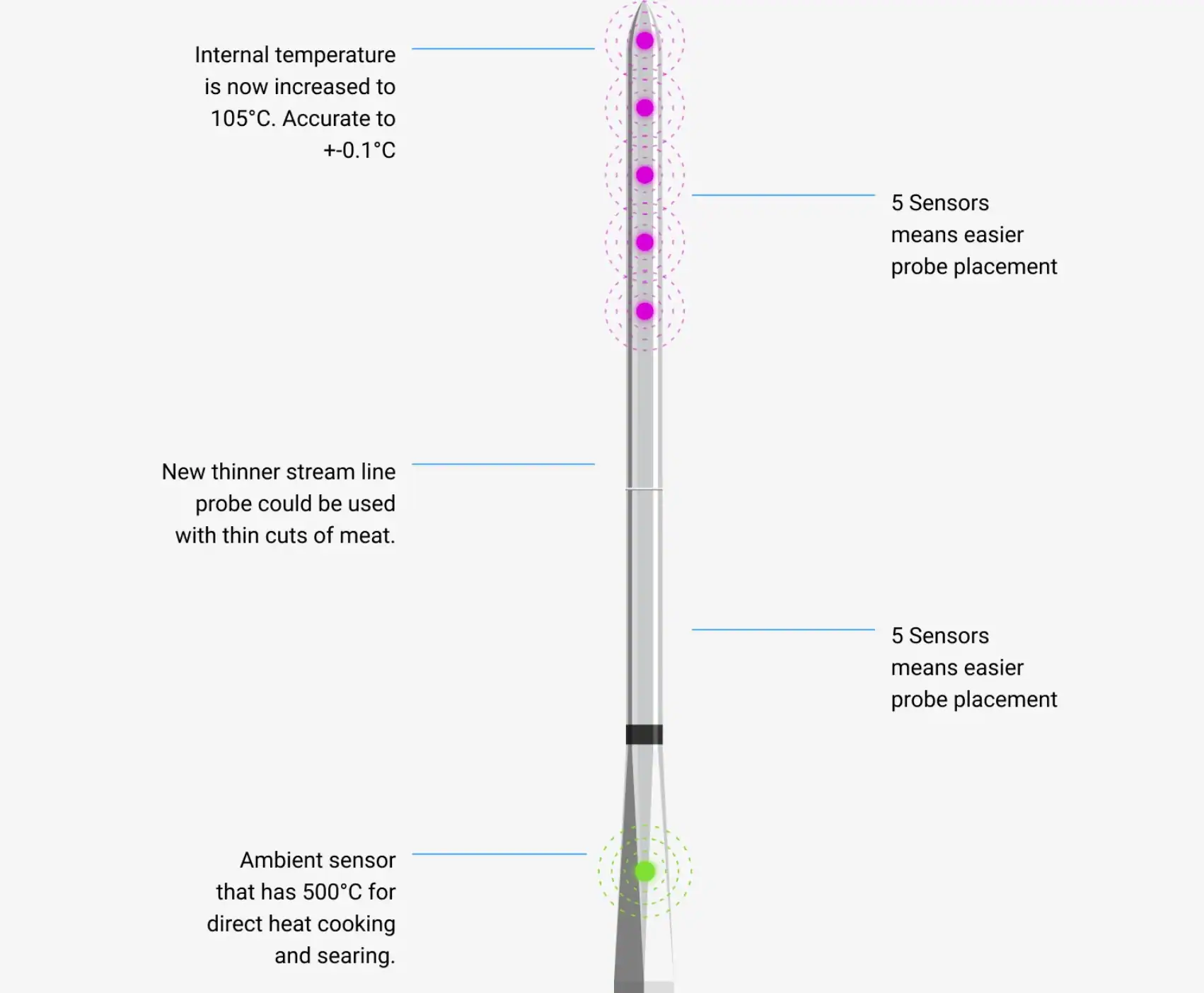 MEATER PRO heeft meer sensoren in de probe waarmee het de kern temperatuur van het vlees meet met nog meer nauwkeurigheid, de PRO kan omgaan met hogere temperaturen aan de binnen- en buitenkant van het vlees, je kunt er dus zelfs direct mee grillen.